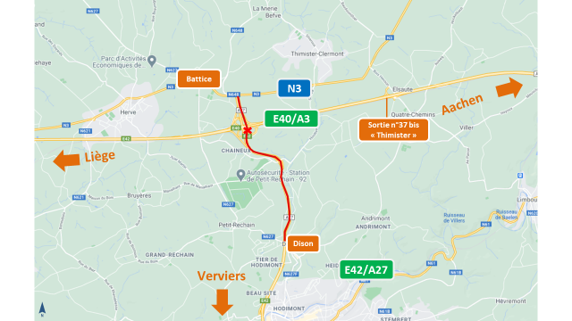 o Lesusagersquicirculerontsurl’E40/A3enprovenanced’Aix-la-Chapelleetde Liège ou sur l’E42/A27 en provenance de Verviers ne pourront pas sediriger vers Battice. Ils seront déviés vers la sortie n°37 bis « Thimister »de l’E40/A3.