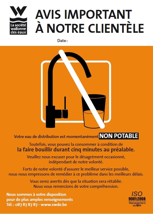 L'eau du robinet aux alentours de la rue Grand Ry à Cornesse est déclarée momentanément "non potable" par la SWDE suite à la découverte de bactéries dans l'eau. Elle peut être consommée à condition de la faire bouillir au préalable 5 minutes.